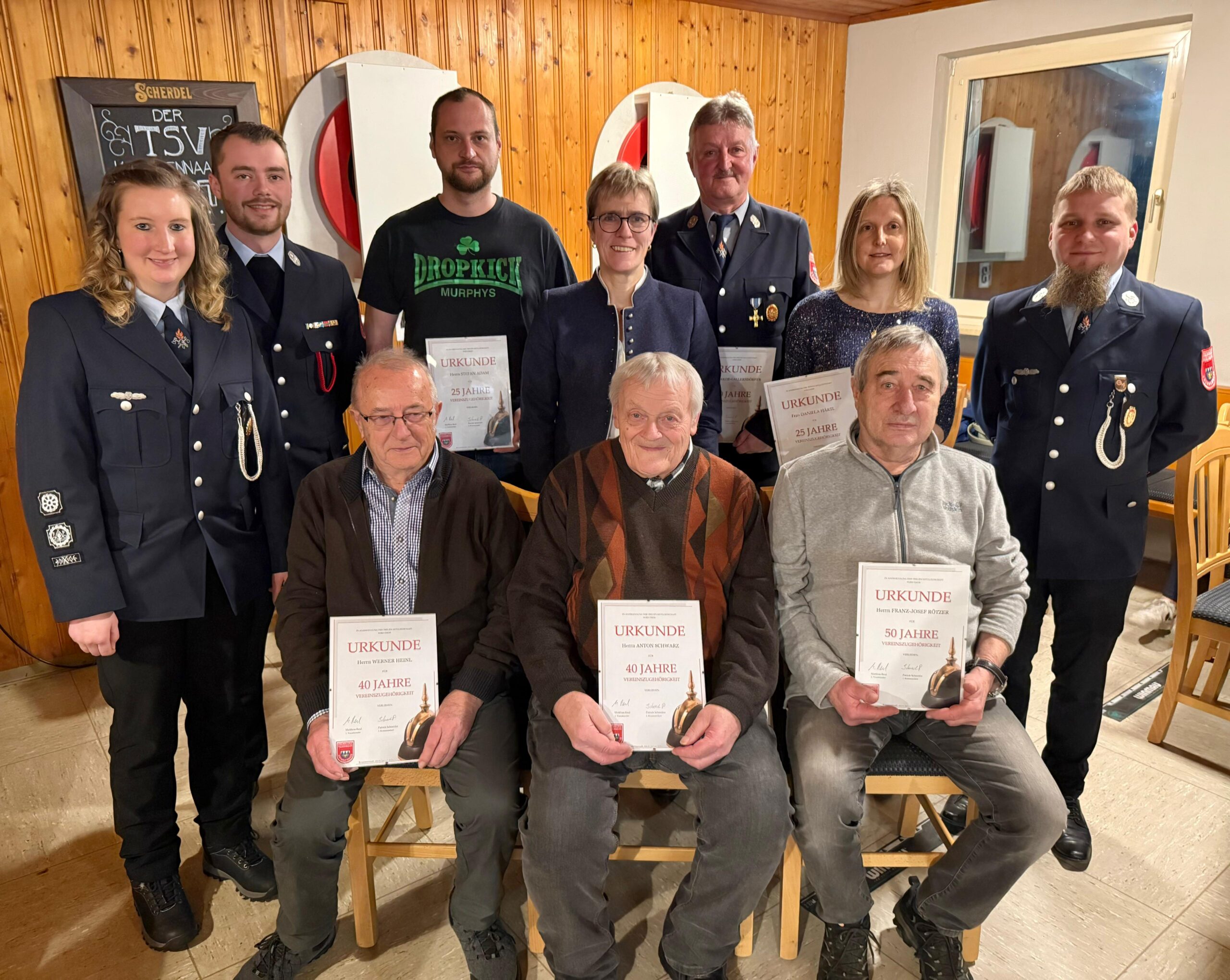 Beförderungen und Ehrungen: Auch dieses Jahr standen wieder Beförderungen und Ehrungen an: Nina Malzer und Mario Hermann zur Oberfeuerwehrfrau bzw. zum Oberfeuerwehrmann. Tristan Uhl und Tristan Hagspiel zum Löschmeister. Schneider gab weiterhin einen Rückblick auf die staatlichen Ehrungen, die im Oktober in Erbendorf durchgeführt wurden. Dabei wurden geehrt für 25 Jahre aktiven Dienst Markus Gallersdörfer, Michael Gröschl, Andreas Heinz, Benjamin Kaßeckert, Alexander Schneider, Stefanie Sieder, Christoph Sieder; für 40 Jahre aktiven Dienst: Markus Krenkel, Martin Gruber, Wolfgang Bauer, Herbert Schmidt. Im Anschluss an diesen Rückblick ehrte Patrick Schneider seine Stellvertreterin Kathrin Gruber für 20 Jahre aktiven Dienst. Auch Vereinsehrungen standen wieder auf der Tagesordnung: Für langjährige Mitgliedschaft im Verein wurden Stefan Adam, Daniela Härtl und Florian Sieder für 25 Jahre, Werner Heinl und Anton Schwarz für 40 Jahre, Jakob Gallersdörfer und Franz-Josef Rötzer für 50 Jahre sowie Albert Lehner und Herbert Vielgut für 70 Jahre ausgezeichnet. Die Ehrungen wurden durch die beiden Kommandanten, Bürgermeisterin Marion Höcht sowie den stellvertretenden Vorsitzenden Tristan Hagspiel vorgenommen.